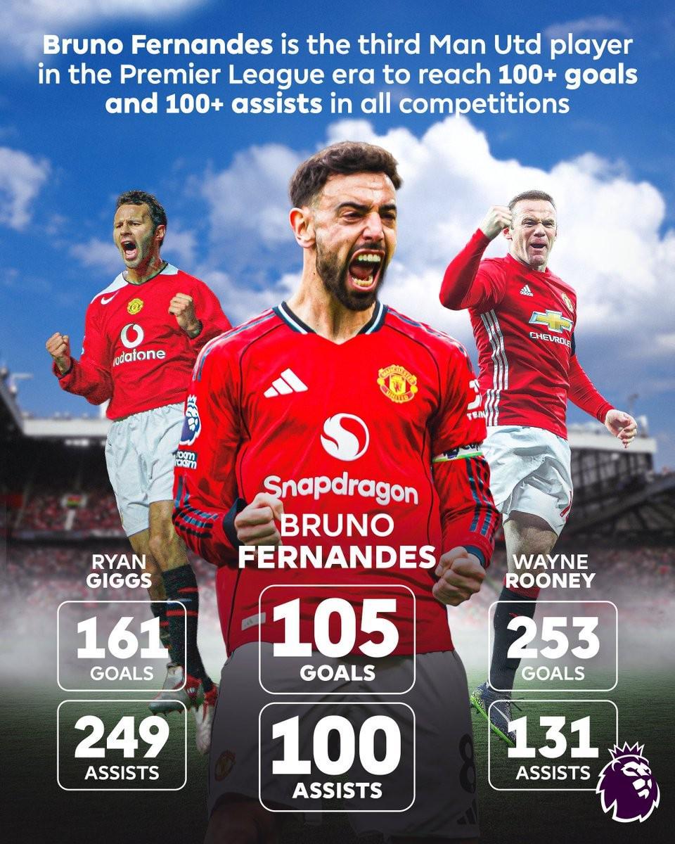 至此,布鲁诺-费尔南德斯曼联生涯已送出100次助攻,此外还打入105球。